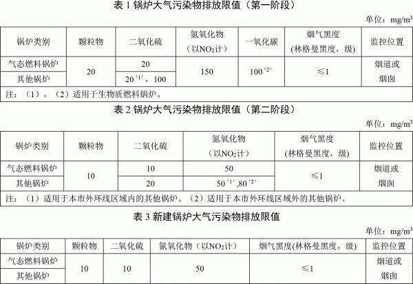上海市地方污染物排放標(biāo)準(zhǔn)《鍋爐大氣污染物排放標(biāo)準(zhǔn)》已經(jīng)上海市人民政府同意,現(xiàn)予以發(fā)布。 標(biāo)準(zhǔn)編號(hào)及名稱為:鍋爐大氣污染物排放標(biāo)準(zhǔn) DB31/387-2018 該標(biāo)準(zhǔn)自2018年6月7日起實(shí)施。 附件:《鍋爐大氣污染物排放標(biāo)準(zhǔn)》 上海市環(huán)境保護(hù)局 上海市質(zhì)量技術(shù)監(jiān)督局 2018年6月7日 鍋爐大氣污染物排放標(biāo)準(zhǔn) 上海市地方標(biāo)準(zhǔn)(DB31/387—2018) 1適用范圍 本標(biāo)準(zhǔn)規(guī)定了鍋爐大氣污染物排放控制要求,監(jiān)測(cè)以及標(biāo)準(zhǔn)的實(shí)施與監(jiān)督等內(nèi)容。 本標(biāo)準(zhǔn)適用于上海市范圍內(nèi)鍋爐大氣污染物的排放管理,以及新建、改建、擴(kuò)建項(xiàng)目的環(huán)境影響評(píng)價(jià)、環(huán)境保護(hù)設(shè)施設(shè)計(jì)、竣工環(huán)境保護(hù)驗(yàn)收、排污許可證核發(fā)及其投產(chǎn)后的大氣污染物排放管理。 本標(biāo)準(zhǔn)適用于單臺(tái)出力65t/h以下的蒸汽鍋爐、熱水鍋爐及有機(jī)熱載體鍋爐。使用醇醚燃料(如甲醇、乙醇、二甲醚等)的鍋爐參照本標(biāo)準(zhǔn)中氣態(tài)燃料鍋爐執(zhí)行。 本標(biāo)準(zhǔn)不適用于以生活垃圾、危險(xiǎn)廢物以及其他非危險(xiǎn)廢物為燃料的鍋爐。 本標(biāo)準(zhǔn)適用于法律允許的污染物排放行為。新設(shè)立污染源的選址和特殊保護(hù)區(qū)域內(nèi)現(xiàn)有污染源的管理,按照《中華人民共和國(guó)大氣污染防治法》、《中國(guó)人民共和國(guó)環(huán)境影響評(píng)價(jià)法》、《上海市環(huán)境保護(hù)條例》、《上海市大氣污染防治條例》等法律、法規(guī)、規(guī)章的相關(guān)規(guī)定執(zhí)行。 2規(guī)范性引用文件 下列文件中的條款通過(guò)本標(biāo)準(zhǔn)的引用而成為本標(biāo)準(zhǔn)的條款。凡是不注日期的引用文件,其最 新版本適用于本標(biāo)準(zhǔn)。 GB 5468鍋爐煙塵測(cè)試方法 GB 13271鍋爐大氣污染物排放標(biāo)準(zhǔn) GB/T 16157固定污染源排氣中顆粒物測(cè)定與氣態(tài)污染物采樣方法 HJ/T 42固定污染源排氣中氮氧化物的測(cè)定紫外分光光度法 HJ/T 43固定污染源排氣中氮氧化物的測(cè)定鹽酸萘乙二胺分光光度法 HJ/T 44固定污染源排氣中一氧化碳的測(cè)定非色散紅外吸收法 HJ/T 56固定污染源排氣中二氧化硫的測(cè)定碘量法 HJ 57固定污染源排氣中二氧化硫的測(cè)定定電位電解法 HJ 75固定污染源煙氣(SO2、NOx、顆粒物)排放連續(xù)監(jiān)測(cè)技術(shù)規(guī)范 HJ 76固定污染源煙氣(SO2、NOx、顆粒物)排放連續(xù)監(jiān)測(cè)系統(tǒng)技術(shù)要求及檢測(cè)方法 HJ/T 373固定污染源監(jiān)測(cè)質(zhì)量保證與質(zhì)量控制技術(shù)規(guī)范(試行) HJ/T 397固定源廢氣監(jiān)測(cè)技術(shù)規(guī)范 HJ/T 398固定污染源排放煙氣黑度的測(cè)定林格曼煙氣黑度圖法 HJ 629固定污染源廢氣二氧化硫的測(cè)定非分散紅外吸收法 HJ 692固定污染源廢氣氮氧化物的測(cè)定非分散紅外吸收法 HJ 693固定污染源廢氣氮氧化物的測(cè)定定電位電解法 HJ 819排污單位自行監(jiān)測(cè)技術(shù)指南總則 HJ 836固定污染源廢氣低濃度顆粒物的測(cè)定重量法 《污染源自動(dòng)監(jiān)控管理辦法》(國(guó)家環(huán)境保護(hù)總局令第28號(hào)) 《環(huán)境監(jiān)測(cè)管理辦法》(國(guó)家環(huán)境保護(hù)總局令第39號(hào)) 3術(shù)語(yǔ)和定義 下列術(shù)語(yǔ)和定義適用于本標(biāo)準(zhǔn)。 3.1 鍋爐boiler 指利用燃料燃燒釋放的熱能或其他來(lái)源的熱能,將水或其他工質(zhì)(如有機(jī)熱載體等)加熱以生產(chǎn)規(guī)定參數(shù)(溫度,壓力)和品質(zhì)的蒸汽、熱水或其他工質(zhì)的設(shè)備,用于工業(yè)生產(chǎn)和/或民用。 鍋爐的額定出力(產(chǎn)熱量)一般以兩種單位來(lái)表示,即熱功率和蒸發(fā)量。熱功率的單位為 MW(兆瓦),蒸發(fā)量的單位為t/h(噸/時(shí))。其換算關(guān)系為0.7MW相當(dāng)于1t/h。 3.2 氣態(tài)燃料gaseous fuel 天然氣、焦?fàn)t煤氣、高爐煤氣等燃燒時(shí)物理狀態(tài)為氣態(tài)的燃料。 3.3 標(biāo)準(zhǔn)狀態(tài)standard condition 指溫度在273K,壓力在101325Pa時(shí)的氣體狀態(tài),簡(jiǎn)稱“標(biāo)態(tài)”。本標(biāo)準(zhǔn)規(guī)定的排放濃度均指標(biāo)準(zhǔn)狀態(tài)下的干煙氣中的數(shù)值。 3.4 氧含量O2 content 燃料燃燒后,煙氣中含有的多余的自由氧,通常以干基容積百分?jǐn)?shù)來(lái)表示。 3.5 煙囪高度stack height 從煙囪(或鍋爐房)所在地平面至煙囪出口的高度。 3.6 新建鍋爐和在用鍋爐new and in-use boiler 新建鍋爐:本標(biāo)準(zhǔn)實(shí)施之日起,環(huán)境影響評(píng)價(jià)文件通過(guò)審批的新建、改建、擴(kuò)建的鍋爐建設(shè)項(xiàng)目。在用鍋爐:本標(biāo)準(zhǔn)實(shí)施之日前,已建成投產(chǎn)或環(huán)境影響評(píng)價(jià)文件已通過(guò)審批的鍋爐。 4大氣污染物排放控制要求 4.1大氣污染物排放限值 4.1.1自本標(biāo)準(zhǔn)實(shí)施之日起至2020年9月30日,在用鍋爐執(zhí)行表1規(guī)定的排放限值。自2020年10月1日起,在用鍋爐(生物質(zhì)燃料鍋爐除外)執(zhí)行表2規(guī)定的排放限值。自2020年10月1日起,在用