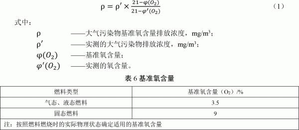 5.5大氣污染物基準(zhǔn)含氧量排放濃度折算方法 實(shí)測(cè)鍋爐顆粒物、二氧化硫、氮氧化物、一氧化碳的排放濃度,應(yīng)按GB/T 16157或GB 5468規(guī)定,采用表6規(guī)定的基準(zhǔn)氧含量按照公式(1)折算為基準(zhǔn)氧含量排放濃度。 折算公式如下: